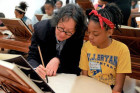 Дюжина учеников пятого класса долго и аккуратно выводят штрихи на пергаменте кистями и черными чернилами, сидя на корточках, на специальных подушках. Несмотря на то, что каллиграфии студентов выглядели как сложные китайские иероглифы, их было легко прочитать, так как они были написаны на английском языке.