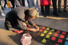 Цуй Сеньжень, уличный каллиграф, своими покалеченными руками пишет мелом китайские иероглифы с благоприятным значением в стиле, который придумал он сам.
